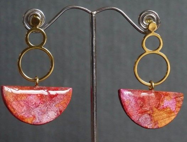 Boucles d'oreilles en argile polymère effet lumière irisée dans les camaïeux roses et orange tel un minéral.